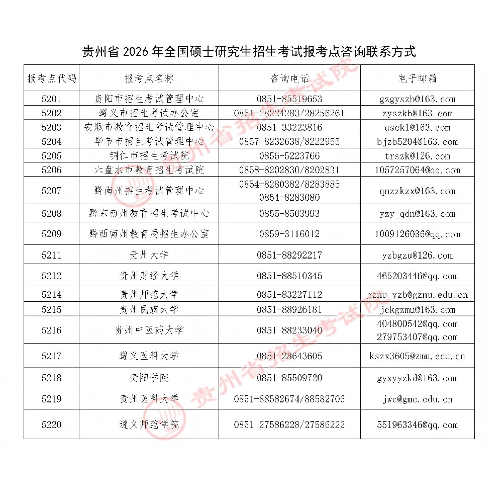 七、贵州省2026年全国硕士研究生招生考试报考点咨询联系方式